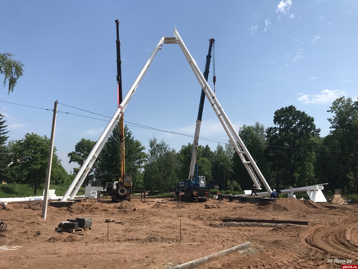 В парке культуры и отдыха Великих Лук идет монтаж самого крупного аттракциона в городе - нового 45-метрового колеса обозрения. Строители устанавливают опоры колеса с помощью подъемного крана.