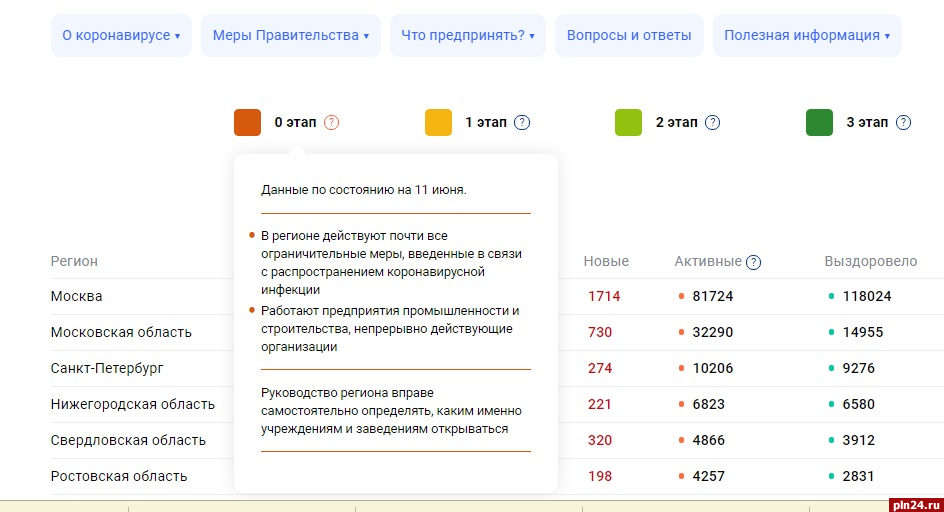 Теперь любой житель России может узнать актуальную информацию о том, каким предприятиям уже разрешено работать в каждом субъекте РФ. В зависимости от этапа, на котором находится регион, он окрашен в оранжевый, желтый, светло- или темно-зеленый цвет.