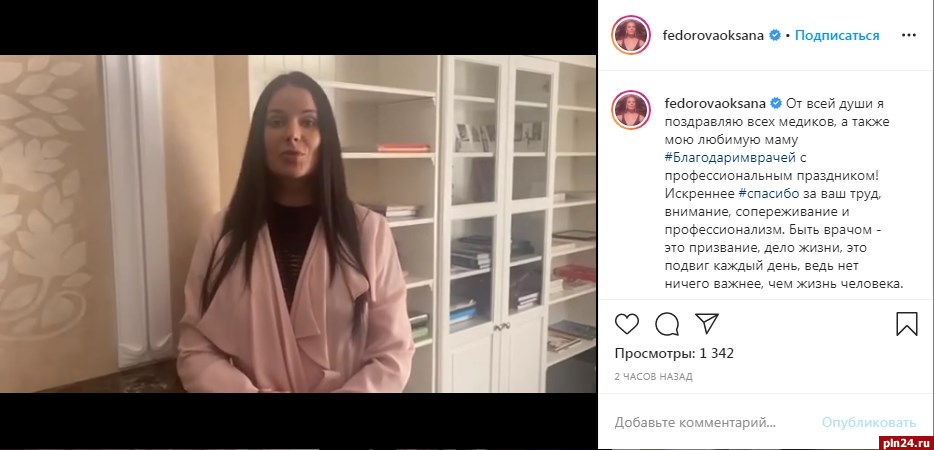 Уроженка Пскова - российская телеведущая, актриса и певица, победительница конкурсов «Мисс Санкт-Петербург», «Мисс Россия» и «Мисс Вселенная» Оксана Федорова присоединилась к многочисленным теплым словам, адресованным медикам в день их профессионального праздника, а также поздравила с торжеством свою любимую маму.