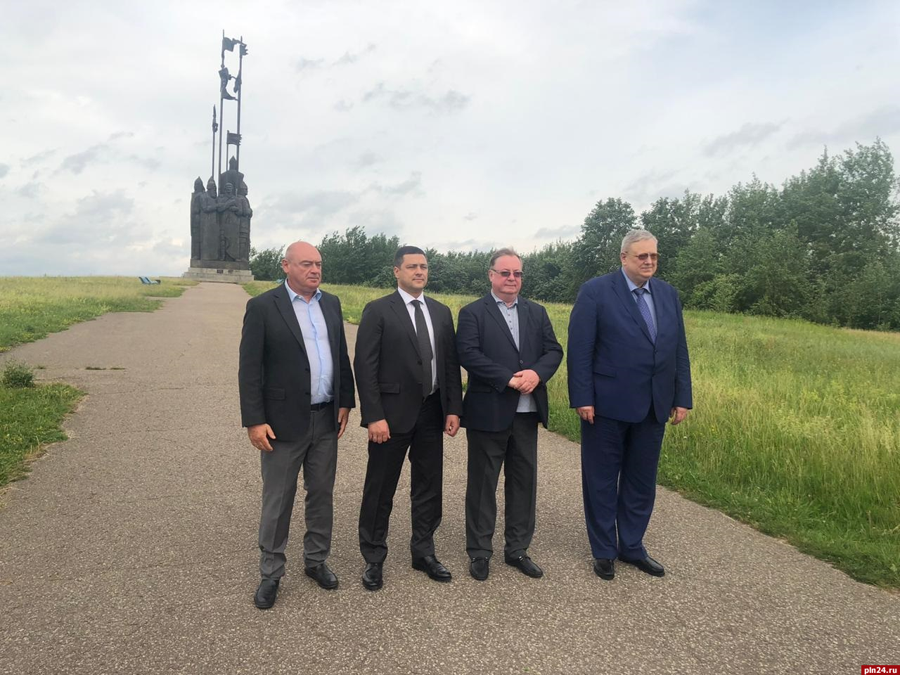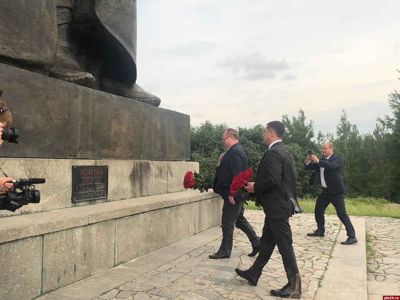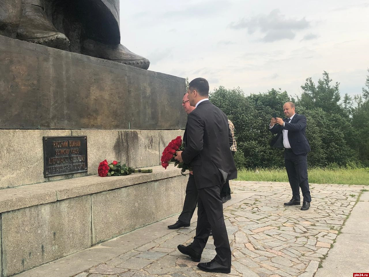 Губернатор Псковской области Михаил Ведерников, председатель наблюдательного совета государственной корпорации – Фонда содействия реформированию ЖКХ, председатель Совета АНО «Возрождение объектов культурного наследия в городе Пскове (Псковской области)» Сергей Степашин и генеральный директор, председатель правления государственной корпорации - Фонда содействия реформированию ЖКХ Константин Цицин возложили цветы к памятнику Александру Невскому и его дружине.
