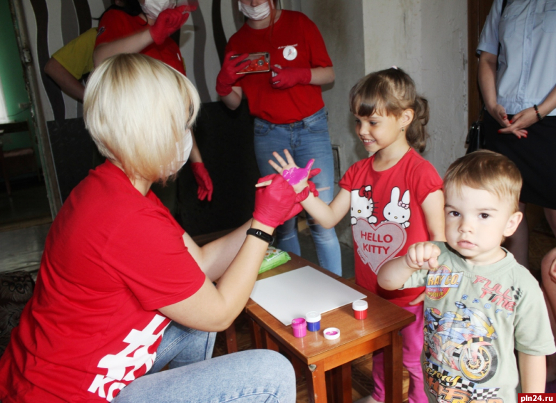 Юные псковичи были очень рады этой встрече. Для них стало приятной неожиданностью получить сразу столько подарков. Еще ребята с удовольствием занимались творчеством: ладошками нарисовали семейный «герб». А волшебному коту, который тоже пришел их навестить, читали стихи и рассказывали о своих планах.