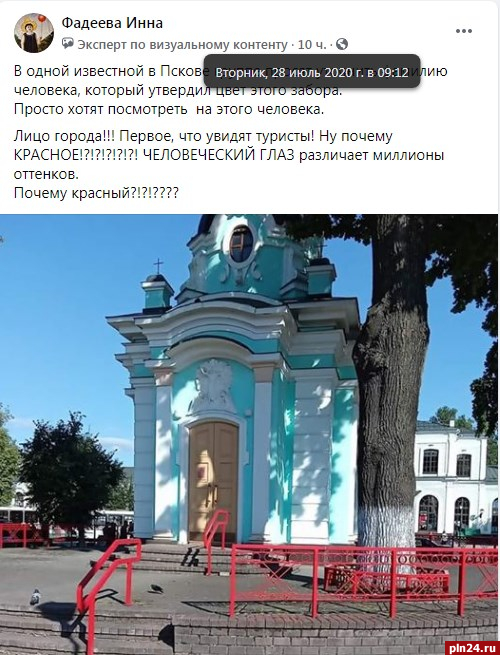 «Лицо города! Первое, что увидят туристы! Ну почему красное? Человеческий глаз различает миллионы оттенков. Почему красный?», - эмоционально возмутились псковичи.