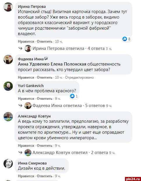 Красный цвет ограды вызвал желание узнать, кто согласовывал работы на объекте, а также массу догадок относительно причин выбора такого колора. Комментаторы соответствующего поста в группе «Псков. Контроль» на Фейсбуке высказывали предположения о том, что во всем виноваты «чинуши», «железнодорожники» или «пьющий прораб».