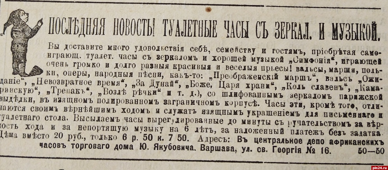 «В Псковских губернских ведомостях от 9 декабря (22 декабря) 1906 г. (№53) можно встретить объявление о туалетных часах. Что обращает на себя внимание? Во-первых, «изящный полированный заграничный корпус». Во-вторых, зеркало в часах. И, наконец, музыка», - отмечается в посте.