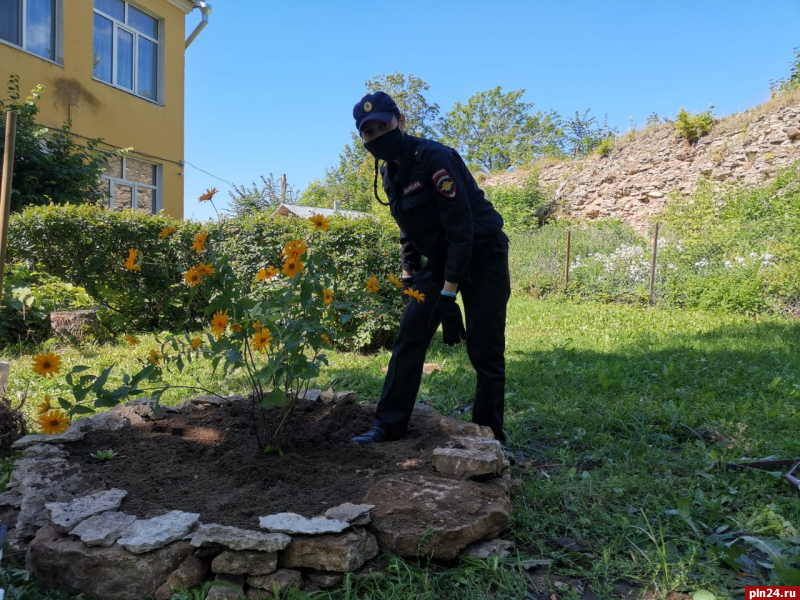 Инспекторы по делам несовершеннолетних УМВД России по городу Пскову Елена Орлова и Екатерина Матюшичева вместе с ребятами, отдыхающими в лагере, оказали волонтерскую помощь в уборке прилегающей территории. В результате совместной работы у здания приюта появилась клумба из камней с ромашками. Кроме этого, в порядок привели имеющиеся цветочные посадки, а территорию очистили от строительного мусора.