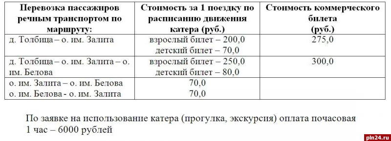 Стали известны тарифы на перевозку пассажиров катером «Талабск» по маршруту Толбица – остров им. Залита – остров им. Белова. Об этом Псковской Ленте Новостей сообщили в пресс-службе администрации Псковского района.