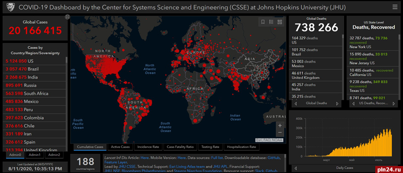 20 млн 166 тысяч 415 человек в мире заразились коронавирусной инфекцией COVID-19. Соответствующую информацию в 22:35 11 августа опубликовал университет Джонса Хопкинса.