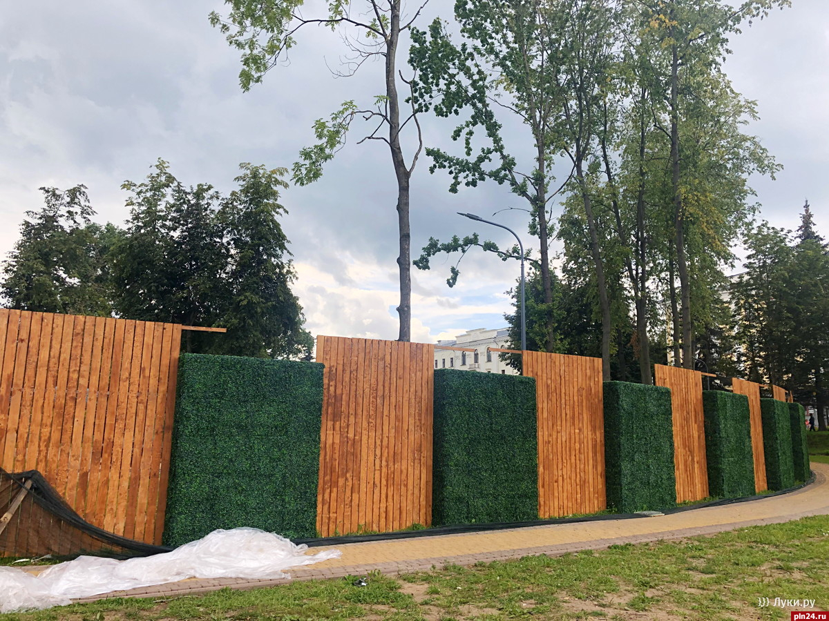 Установка ограждения также выходит на финишную прямую. Зеленую изгородь дополнили деревянные элементы, которые сменили сетку.
