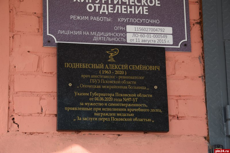 Открытие мемориальной доски в память о враче Алексее Поднебесном состоялось у входа в хирургическое отделение Опочецкой межрайонной больницы в среду, 16 сентября. Об этом Псковской Ленте Новостей сообщили в пресс-службе администрации региона.