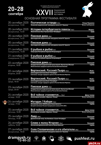 И я завершаю. Слава Богу, на более радостной ноте. Особенно - для поклонников Мельпомены. 20 сентября, в воскресенье, наконец-то откроется XXVII Пушкинский театральный фестиваль, в эту несчастную «коронавирусную» пору уж точно - главное культурное событие года. Шахматная рассадка зрителей в зале пока не отменена, но фестиваль пройдет не онлайн, как весной, а вживую, по-настоящему, со зрителями в зале.