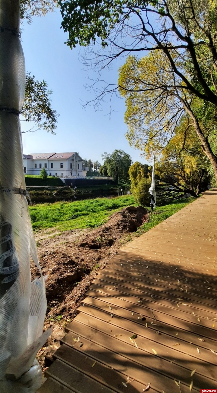 Кроме того, уложен настил на дорожке вдоль реки, и на этой траектории также установлены фонарные столбы.