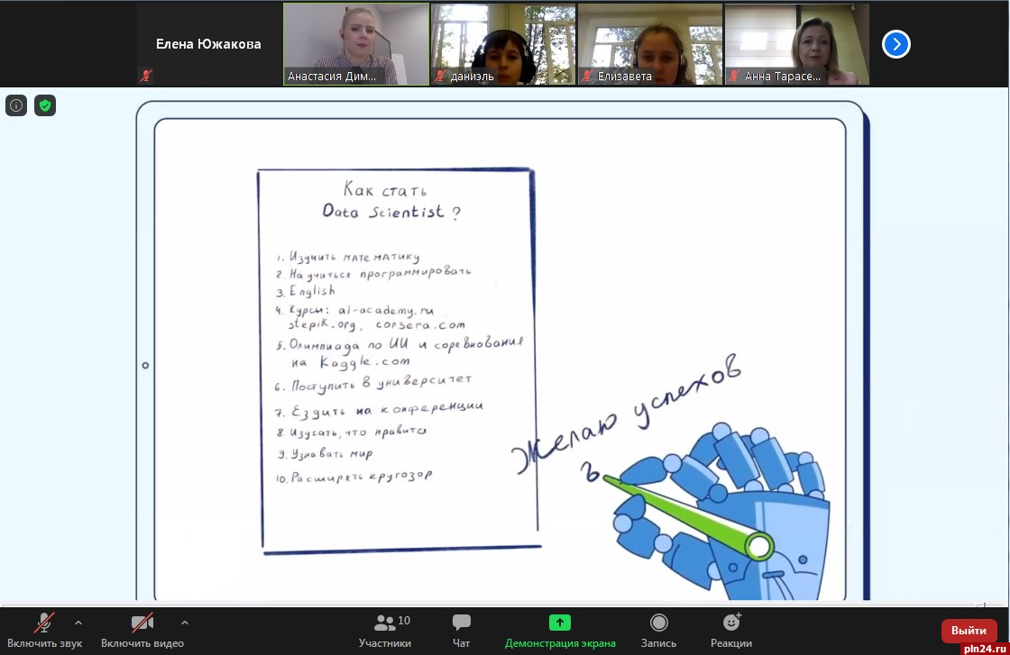 Интересовали ребят и научные возможности искусственного интеллекта: чем он может помочь исследователям, к каким открытиям приблизить человечество. Анна Тарасенко рассказала, что в современной медицине многое делается именно благодаря ИИ. Так, недавно в дочерней организации СберБанка был разработан программный комплекс, который помогает определять по компьютерной томографии наличие у человека коронавируса. Эта программа бесплатно будет распространена по всем регионам России, решается вопрос о ее установке и в Псковской области. «Искусственный интеллект быстро все оценивает и позволяет человеку провести более точную диагностику», - подчеркнула Анна Владимировна.