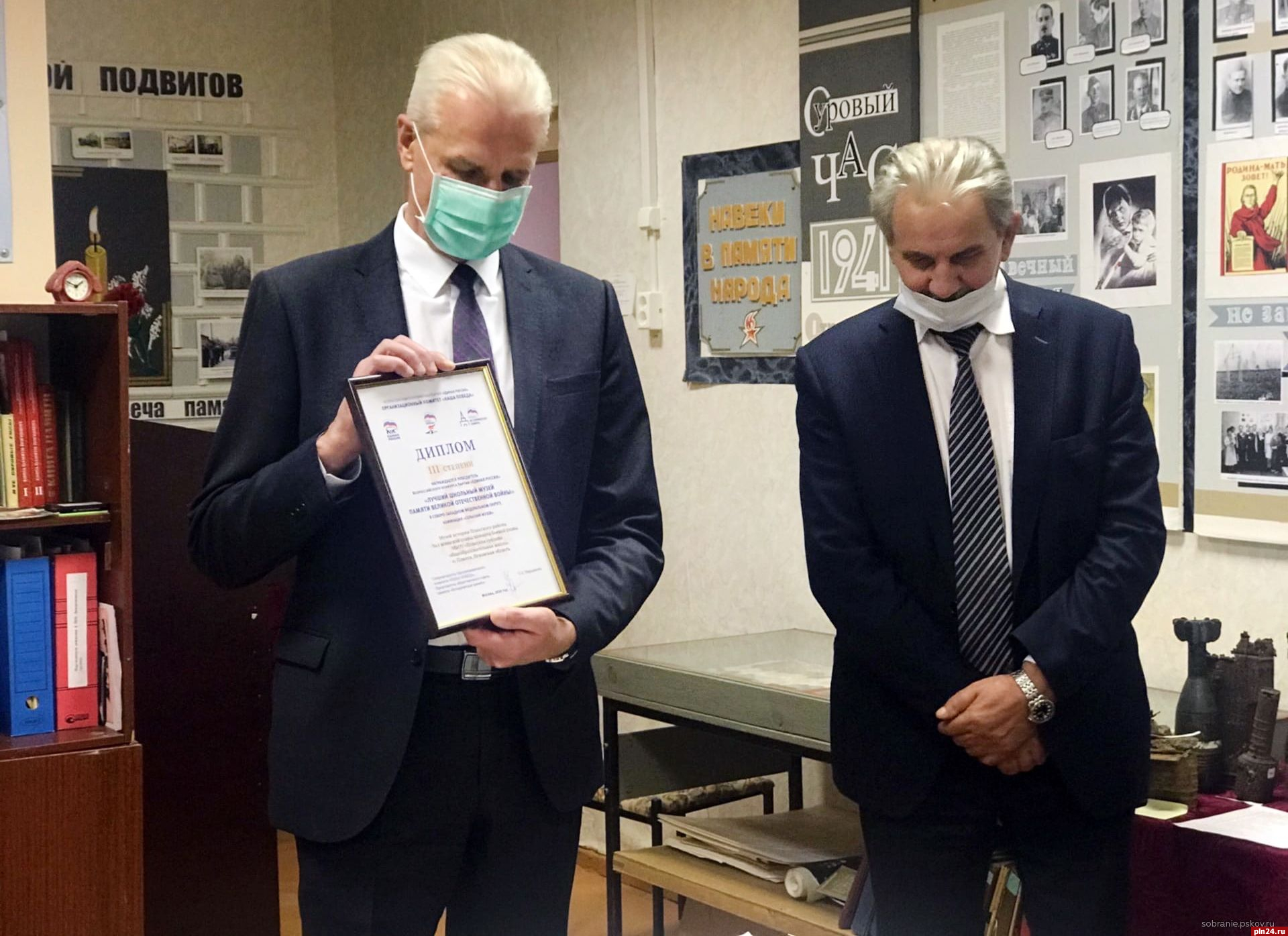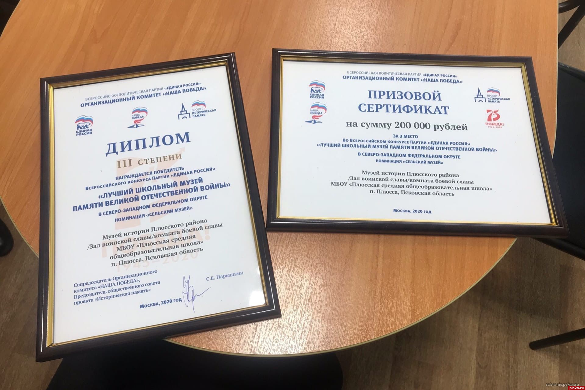 Диплом победителя всероссийского конкурса на лучший школьный музей памяти Великой Отечественной войны передал директору Плюсской средней общеобразовательной школы, депутату областного Собрания Оксане Лазаревой спикер парламента, заместитель секретаря регионального отделения «Единой России» Александр Котов. Комната боевой славы поселковой школы заняла третье место в номинации «сельский музей» и получила денежный сертификат на развитие проекта, рассказали Псковской Ленте Новостей в пресс-службе регионального парламента.