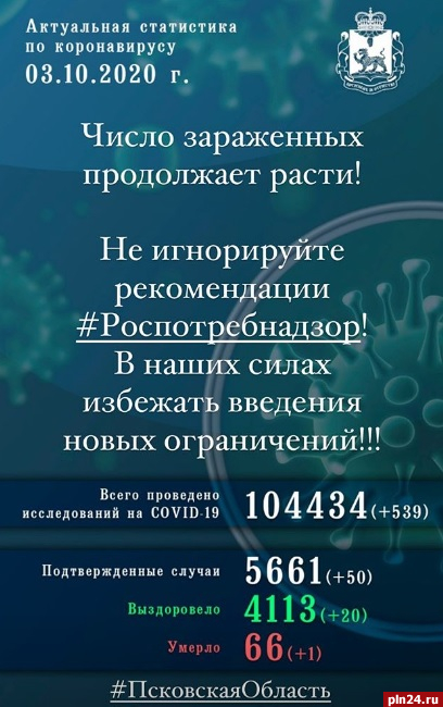 50 человек заболели коронавирусом в Псковской области за сутки. Как сообщил в воскресенье, 4 октября, в своем инстаграм-аккаунте губернатор Михаил Ведерников, число заболевших продолжает расти.