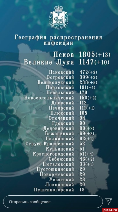 Из числа 50 новых случаев 13 приходится на Псков, 10 – на Великие Луки.
