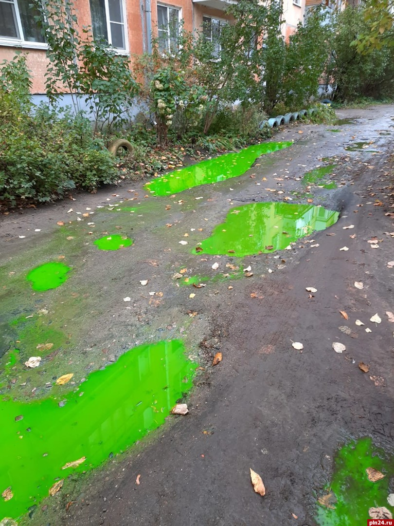В одном из дворов на улице Яна Фабрициуса в Пскове лужи окрасились в неестественно яркий зеленый цвет. На это обратил внимание один из подписчиков группы «Инцидент Псков», который выложил фотографии с этим необычным явлением.
