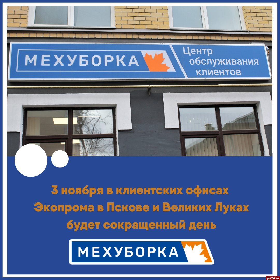 3 ноября Центры обслуживания клиентов компании «Экопром» в Пскове и Великих Луках будут работать до 17.00. Сокращенный рабочий день будет и в call-центрах, сообщили Псковской Ленте Новостей в компании.