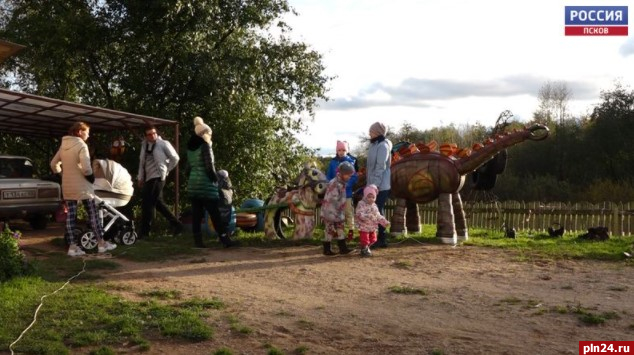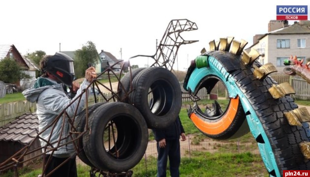 На первого динозавра ушло две недели и 50 автомобильных шин, сообщает ГТРК «Псков». В создании фигур принимают участие не только взрослые, но и дети.