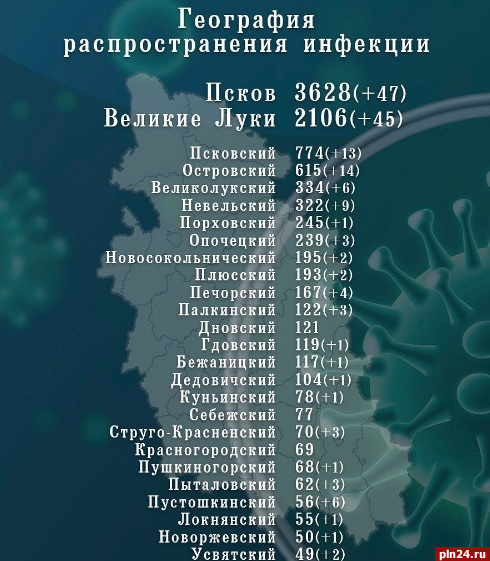 Затем идет Псковский район, где за сутки прибавилось 13 зараженных (всего заражены инфекцией 774 человека) и Невельский район с 9 заболевшими за сутки (всего 322 случая заражения вирусом).