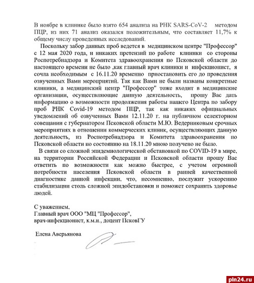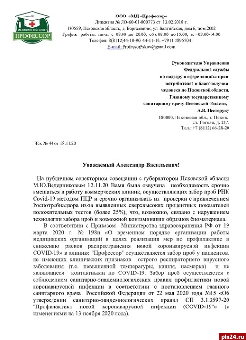 Главный врач ООО «МЦ «Профессор» Елена Аверьянова отправила официальное обращение руководителю ТУ Роспотребнадзора по Псковской области Александру Нестеруку. Поводом для письма стала ситуация, спровоцированная его высказыванием на совещании с медиками под председательством губернатора Михаила Ведерникова 12 ноября, пишет «МК в Пскове».