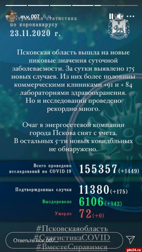 175 человек заразились коронавирусной инфекцией в Псковской области за прошедшие сутки. За все время пандемии COVID-19 подтвердили у 11380 жителей региона, сообщил губернатор Михаил Ведерников в своем Instagram-аккаунте.