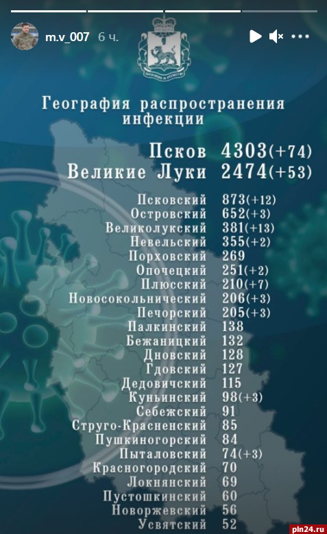 178 человек заразились коронавирусной инфекцией в Псковской области за прошедшие сутки. За все время пандемии COVID-19 подтвердили у 11558 жителей региона, сообщил губернатор Михаил Ведерников в своем Instagram-аккаунте.