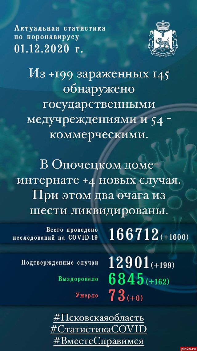 В Псковской области обновлен антирекорд по приросту заболевших новой коронавирусной инфекцией в сутки. Согласно опубликованной губернатором региона Михаилом Ведерниковым в соцсети Instagram статистике, за первый день зимы в области выявлено 199 зараженных COVID-19.