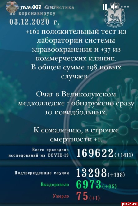 198 человек заразились коронавирусной инфекцией за прошедшие сутки в Псковской области. За все время пандемии в регионе COVID-19 подтвердили у 13298 человек, сообщил в своем Instagram-аккаунте губернатор Михаил Ведерников.