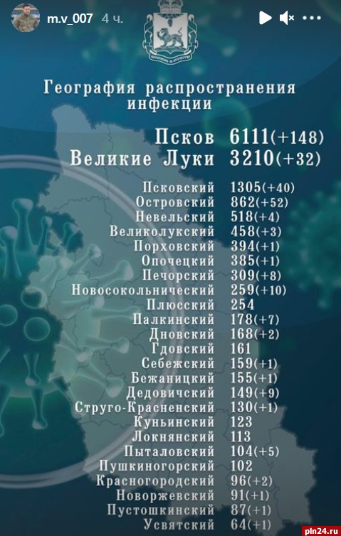 330 человек заразились коронавирусной инфекцией в Псковской области за прошедшие сутки. С начала пандемии в регионе COVID-19 подтвердили у 15945 человек, сообщил губернатор Михаил Ведерников в своем Instagram-аккаунте.