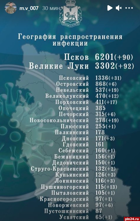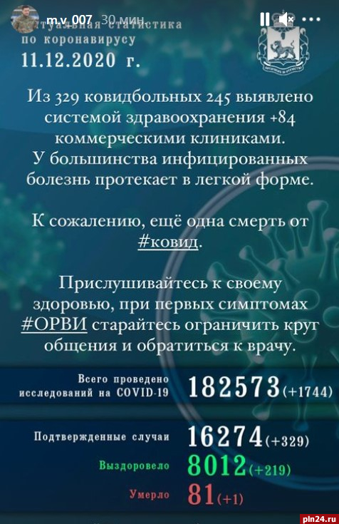 16274 человека заразились коронавирусной инфекцией в Псковской области за все время пандемии. За сутки COVID-19 подтвердили у 329 человек, сообщил губернатор Михаил Ведерников в своем Instagram-аккаунте.