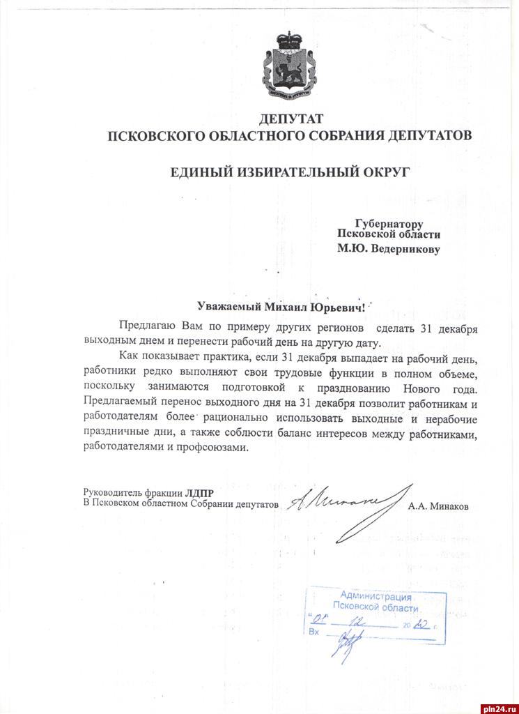 Псковские либерал-демократы предлагали сделать 31 декабря выходным еще месяц назад. Об этом свидетельствует соответствующее обращение координатора Псковского регионального отделения ЛДПР, депутата Псковского областного Собрания Антона Минакова в адрес губернатора Михаила Ведерникова.