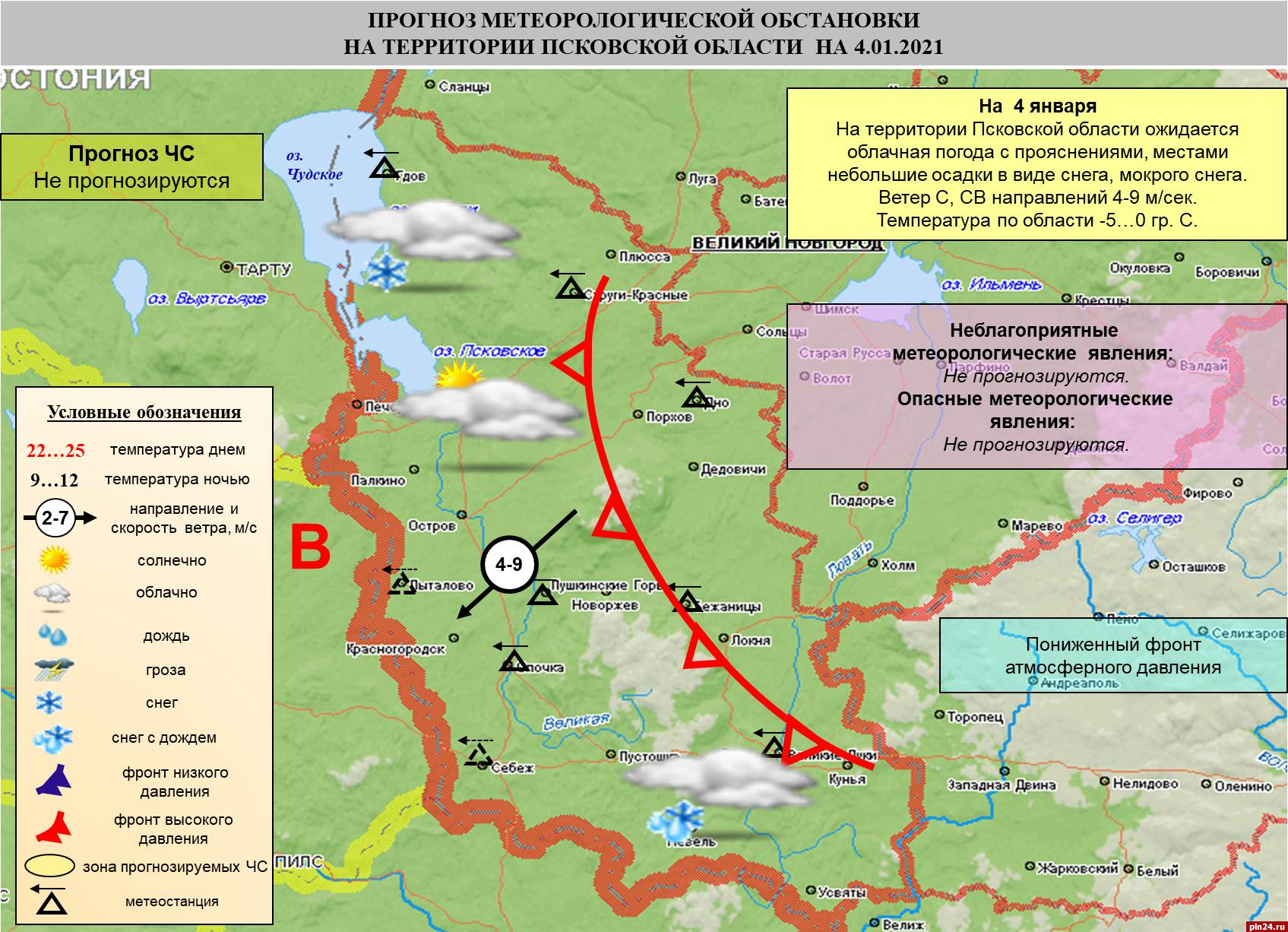 По данным Псковского ЦГМС, в понедельник, 4 января, на территории Псковской области ожидается облачная погода с прояснениями, местами небольшие осадки в виде снега, мокрого снега.