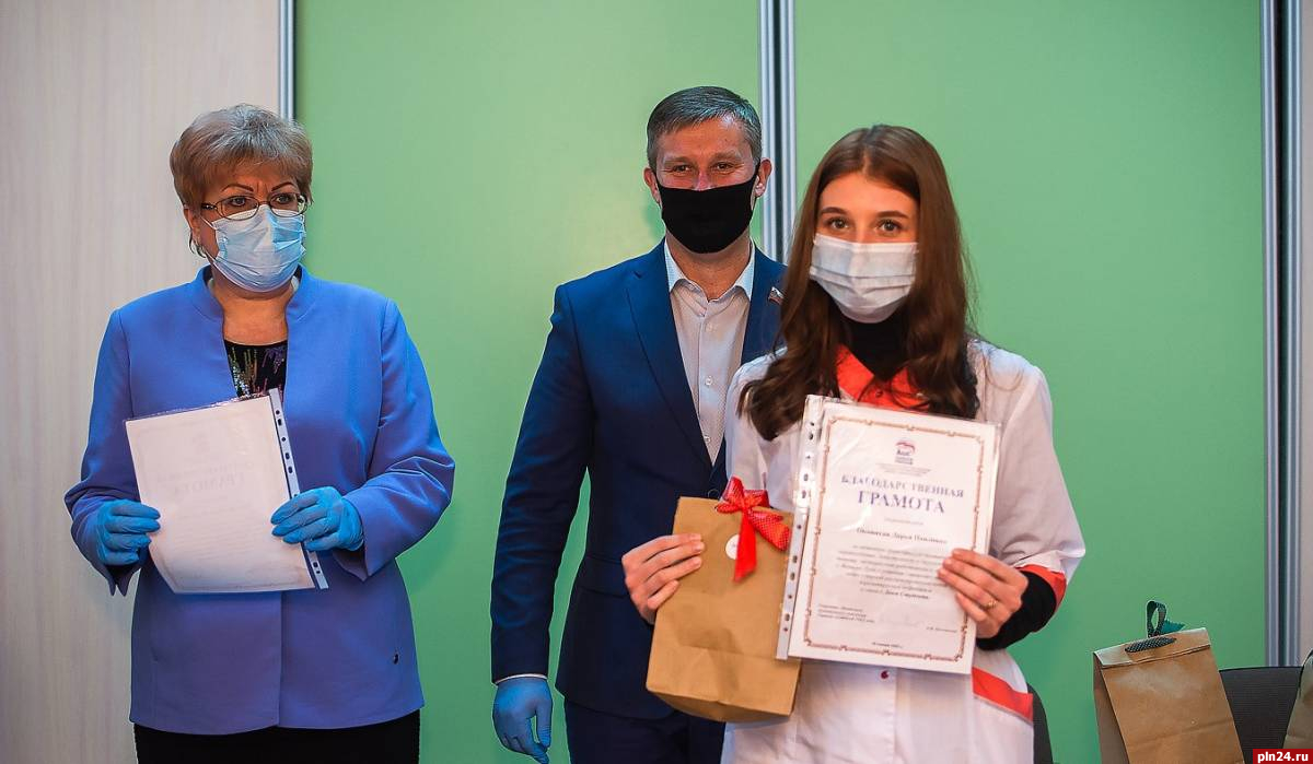 Елена Даньшова и Андрей Корнев вручили студентам-волонтерам благодарственные письма от руководителя Псковского волонтерского центра, секретаря регионального отделения «Единой России» Александра Козловского, передали памятные подарки с партийной символикой, поблагодарили за отзывчивость и пожелали здоровья и успехов в учебе. Благодарственное письмо также передали и педагогу Юлии Поляковой за личный вклад в волонтерскую деятельность, активную гражданскую позицию, добровольную и бескорыстную помощь медицинским работникам и жителям Великих Лук в решении социально значимых задач в период пандемии