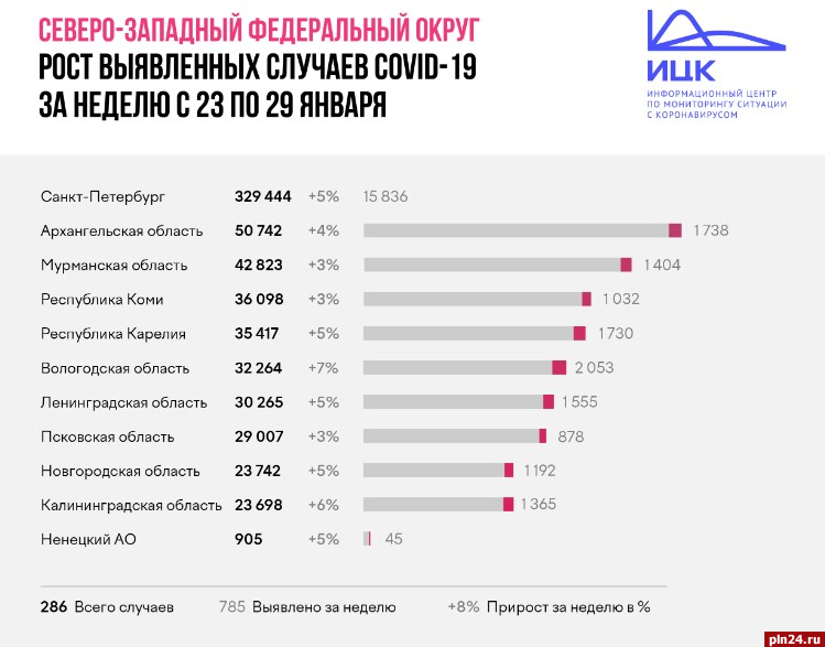 Наименьшее количество выявленных случаев COVID-19 в процентном соотношении наблюдалось с 23 по 29 января в трех регионах Северо-Западного федерального округа, показатель там составил 3%. Как сообщили Псковской Ленте Новостей в Информационном центре по по мониторингу ситуации с коронавирусом, в их число вошли Мурманская область (+1 404), Коми (+1 032) и Псковская область (+878).