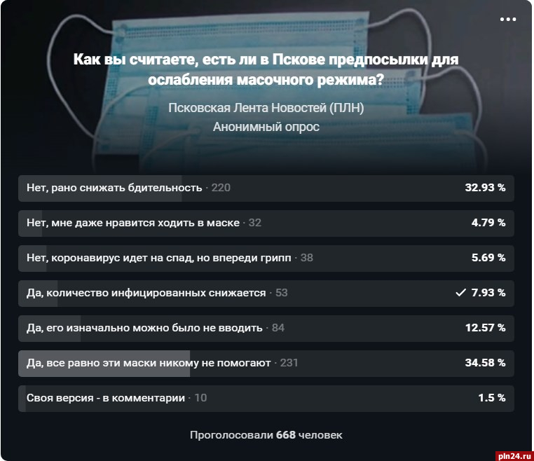 Опрос, проведенный в группе Псковской Ленты Новостей ВКонтакте, показал, что количество «масочных диссидентов» и «защитников масок» примерно одинаково. Отвечая на наш вопрос о том, есть ли в нашей области предпосылки для ослабления масочного режима, 32,8% респондентов согласились с мнением, что снижать бдительность пока рано. Впрочем, 34,4% уверены, что маски уже можно потихоньку снимать: они, мол, все равно не помогают. Достаточно большое количество участников опроса - 12,69% - считают, что масочный режим изначально можно было не вводить.