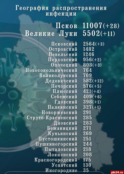 За сутки в Псковской области коронавирус выявили у 76 человек. Всего зафиксировано 30 тысяч 411 случаев COVID-19, сообщил в своем инстаграм-аккаунте губернатор Михаил Ведерников.