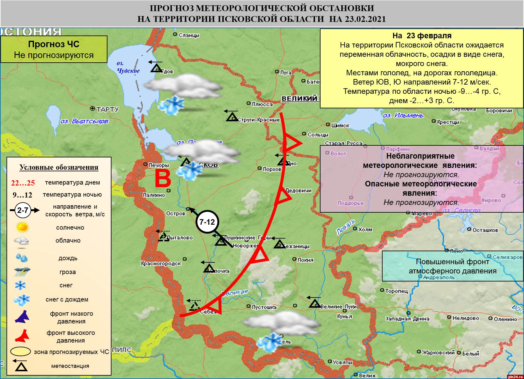По данным Псковского ЦГМС, во вторник, 23 февраля, на территории Псковской области ожидается переменная облачность, осадки в виде снега, мокрого снега. Местами гололед, на дорогах гололедица.