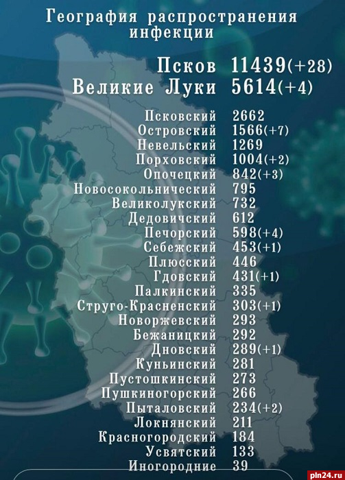 Добавим, за весь период в псковском регионе проведено 271536 исследований от коронавируса (820 за сутки).Подтверждено 31596 случаев COVID-19 (+54), выздоровели 20662 (+69).