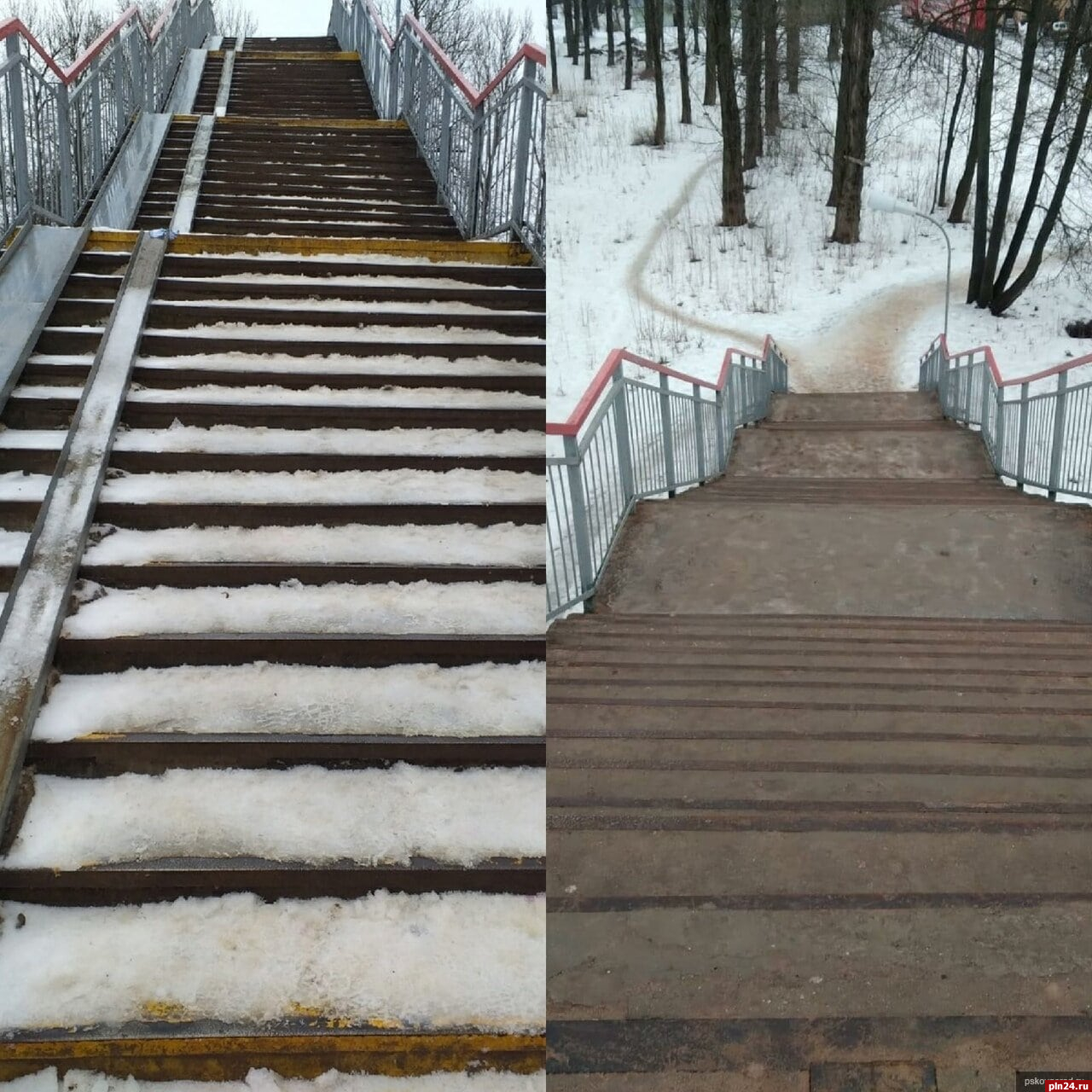 Напомним, что ранее жители города неоднократно жаловались на неудовлетворительное состояние пешеходного моста через железнодорожные пути в районе станции «Псков-Пассажирский». Так, горожанка в своей жалобе, опубликованной 24 февраля в группе «Жесть по-псковски», назвала сооружение «полозьями для смертников». Скользкие ступени, покрытые льдом, создавали опасность для спуска и подъема.
