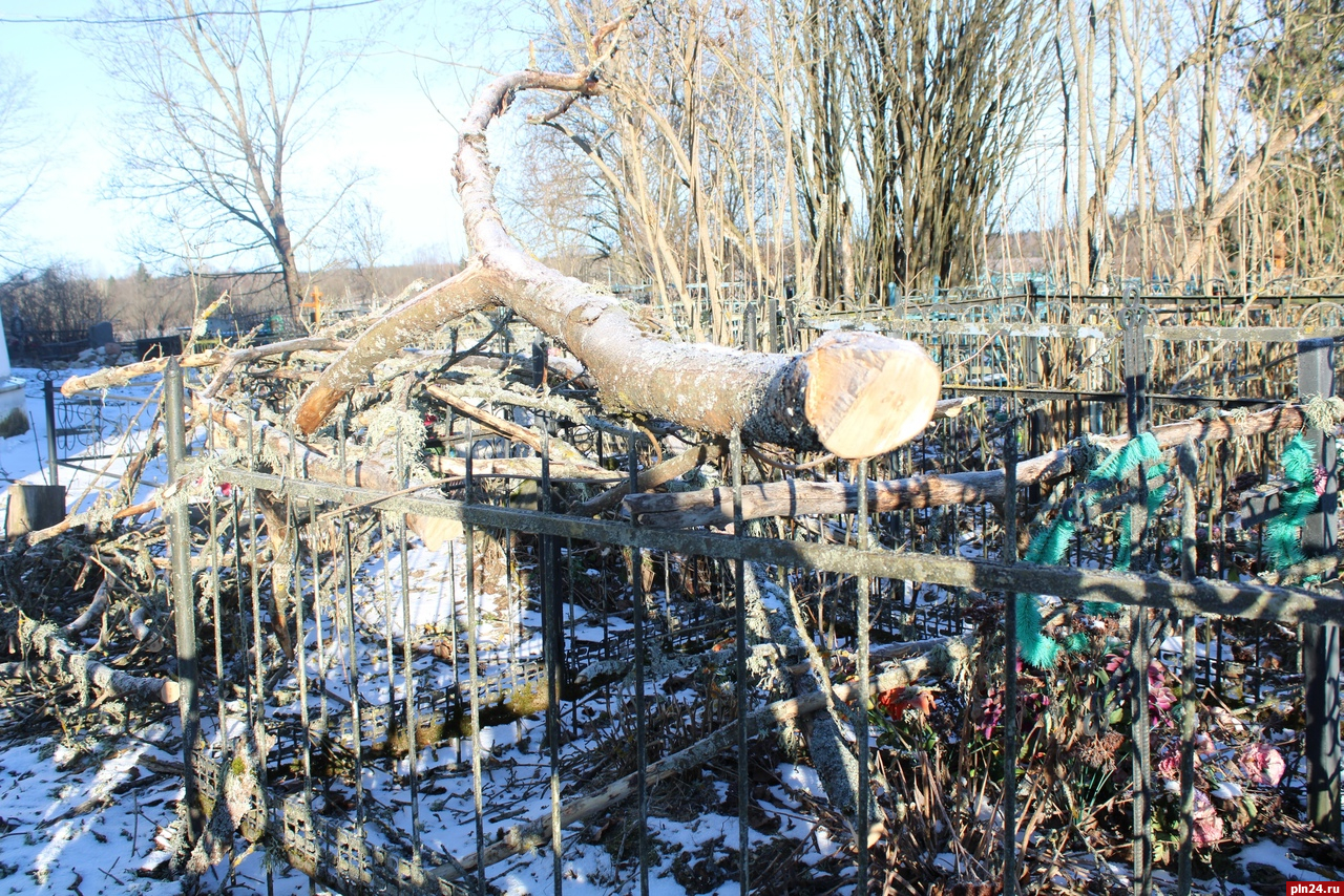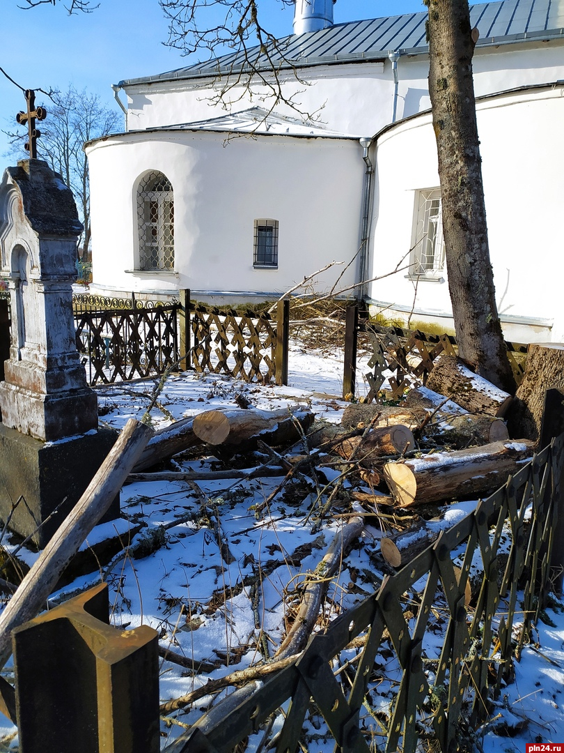 Накануне Вселенской родительской субботы на кладбище около храма Архангела Михаила с Кухвы в Островском районе провели обрезку деревьев. Работа выполнили так, что повредили памятники и ограды, сообщается в группе Спасо-Казанского женского монастыря в соцсети «ВКонтакте».