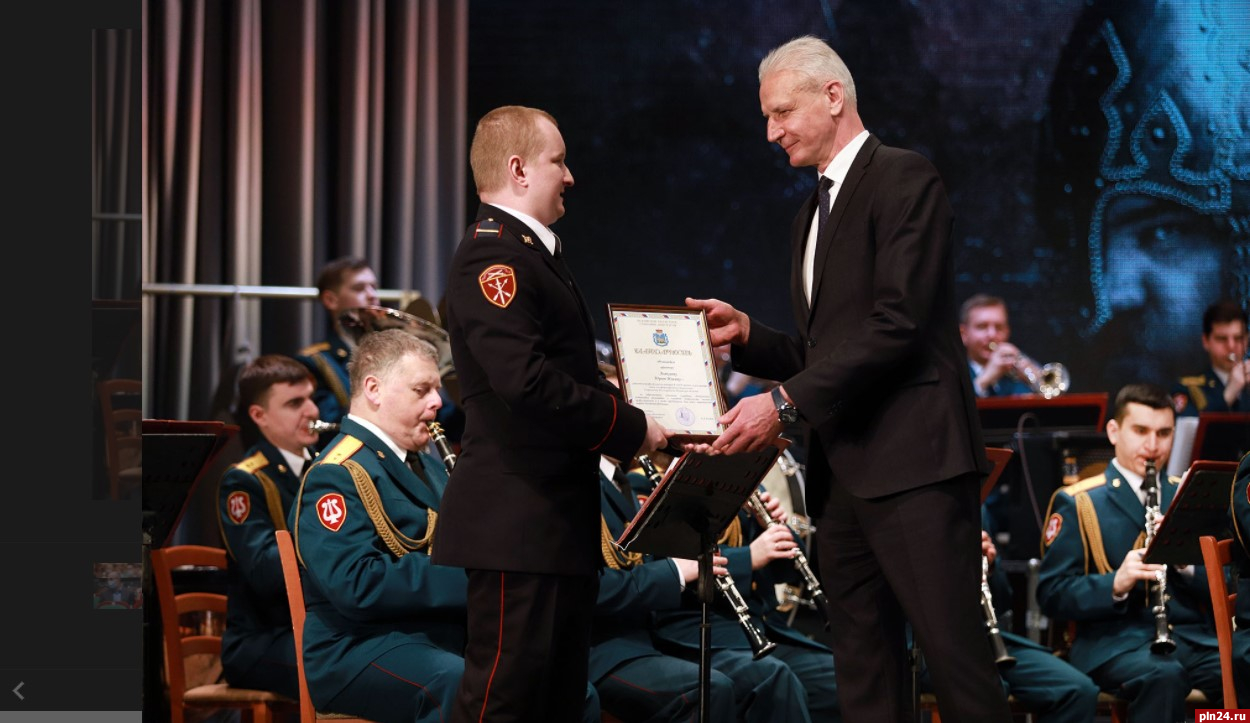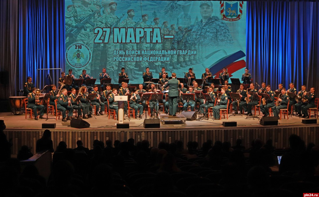 Мероприятие началось с выступления образцово-показательного оркестра войск национальной гвардии России – накануне музыкальный коллектив участвовал в закрытии 47-й фестиваля русской музыки имени Мусоргского и Римского-Корсакова в Пскове.