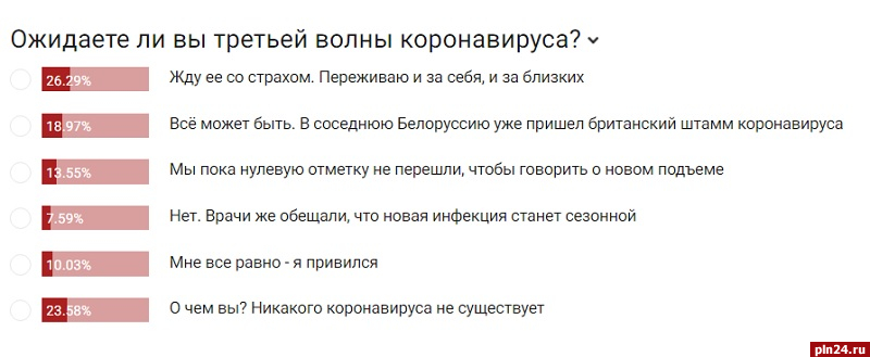 Более 26% читателей Псковской Ленты Новостей со страхом ждут третьей волны коронавируса. Об этом свидетельствуют итоги свежего опроса, проведенного на сайте ПЛН. Читателям предлагалось ответить на вопрос «Ожидаете ли вы третьей волны коронавируса?», выбрав один вариант ответа.